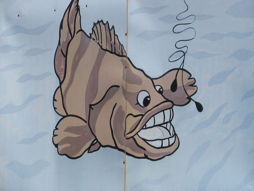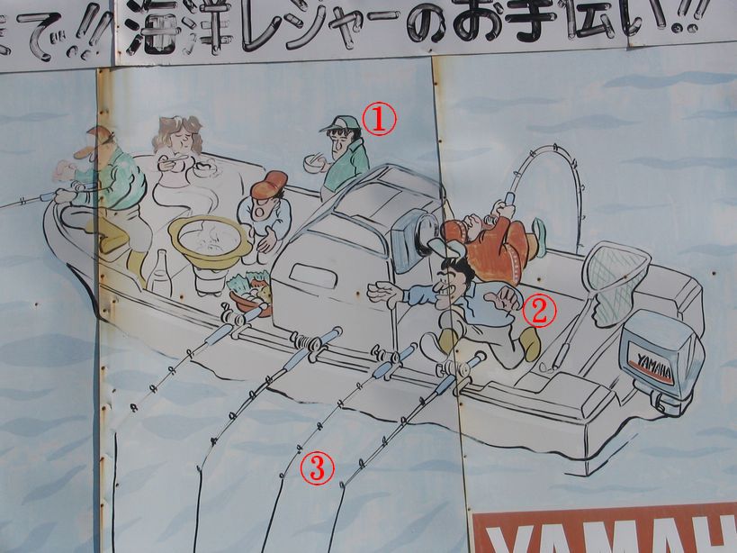 こんな歯並びのイイ魚は居らんやろぉ!ってゆーか、魚の歯ぢゃねぇし!しかも、仕掛けに錘(おもり)が2個も付いとるけど肝心の針が付いてない。しかもしかも、錘が2個も付いてるのに糸がメチャクチャ弛んどるし。ちなみに、この魚を釣ろうとしてるのは舳先のオッサンだ。このオッサン、やる気が1%も感じられのがなんとも・・・。